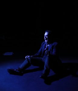 There are numerous ways this story can unfold for an audience. Interestingly enough this production, under the direction of Jacob Smith, has made the choice to present the Woman in Black as seen through the eyes of The Actor. There are no scrims here, no overly flashy theatrics. As The Actor wrestles with the idea that he has witnessed something which logic tells him cannot be real, but his eyesight interprets as being real, we the audience see the Woman in Black (played with effective intensity by Amanda Rae Troisi) in the same manner – she is real. The Actor must convince himself she is real because any other option is too frightening for him to consider. It’s a fascinating theatrical choice for it gives the Woman a sense of foreboding and a sense of purpose that might be missing if she were presented as a possible trick of The Actor’s mind. Also, playing this straight adds weight to several moments where the Woman in Black expresses her frustration and rage. It also adds an eerie sense of mystery when she simply hovers, letting her presence be known. For the Actor, he manages to justify the Woman’s presence as part of the story he is being told, even as the encounters become very intimate as he comes face-to-face, literally, with this spectre in his midst.
